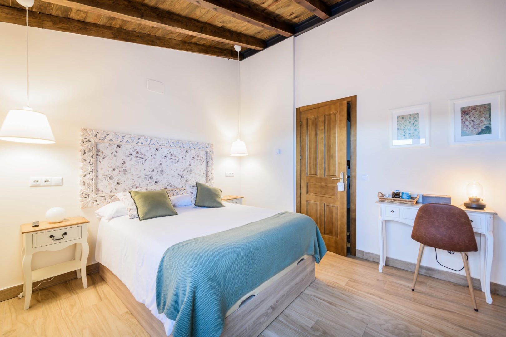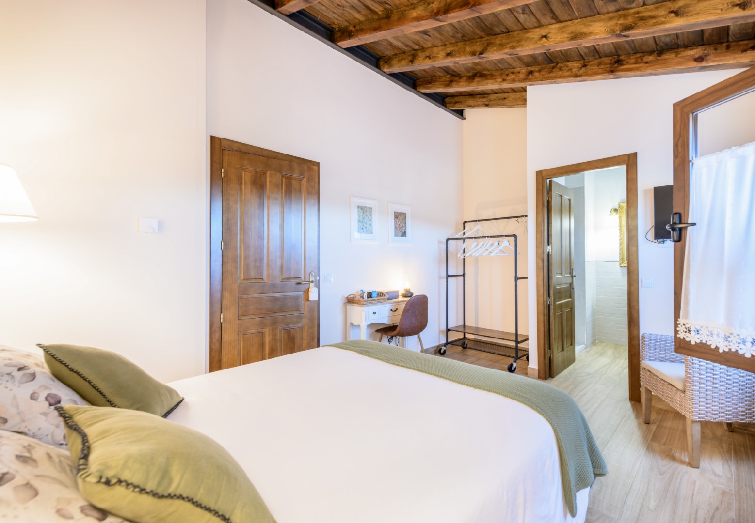 Habitación doble con cama de matrimonio y baño completo, pensada para quienes buscan una estancia cómoda y sencilla en un entorno rural tranquilo.